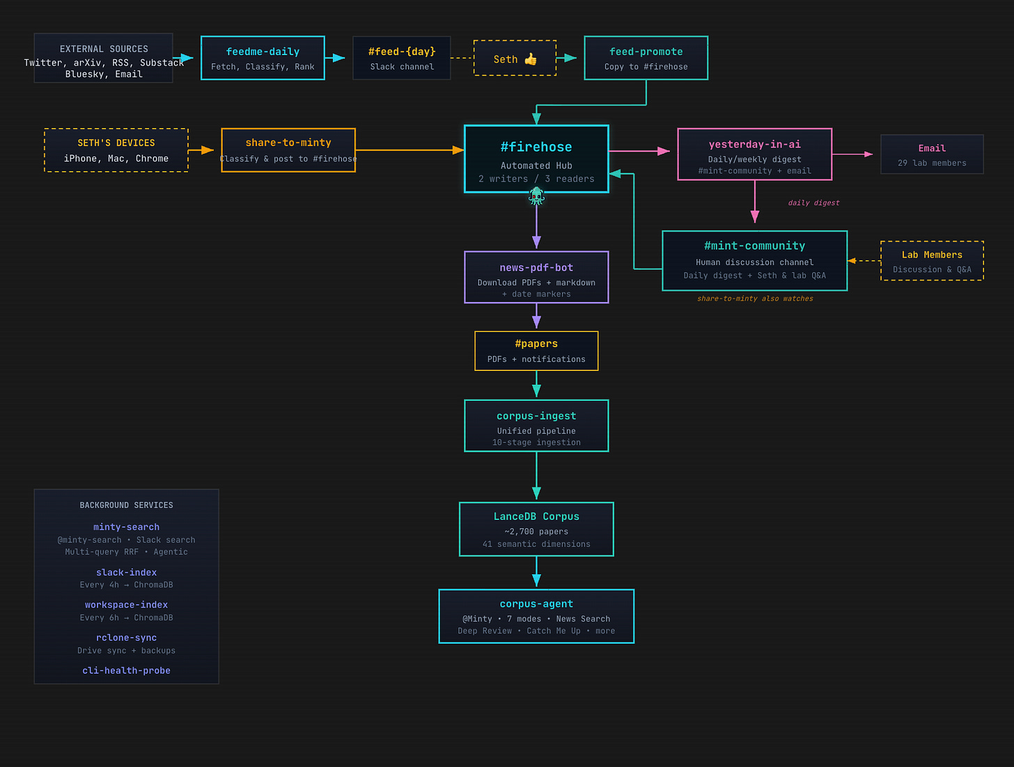 Sidebar: one thing that has surprised me about this: now that I’ve got an agent that I trust reading content for me and letting me know what’s worth my attention, I’ve paid for a bunch of Substack subscriptions where previously I just kept the free version. Not what I expected. I’ve also noticed that when I am on social media (still X, because that’s where AI is), I’m more inclined to post than I used to be. I’m on there because I’m having a conversation; not because I’m frantically trying to follow the latest research—because Minty does that for me.